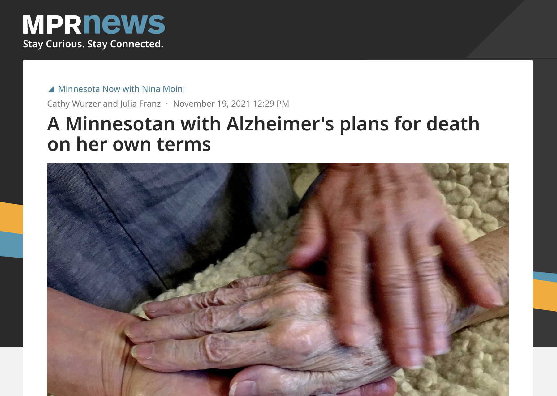 DEATH on Her Own Terms: A Minnesota Woman's Journey Family celebrates life of woman who voluntarily passed after Alzheimer’s diagnosis Alzheimer’s, love and loss: The conversation continues A terminally ill Hopkins woman shares her plans to die with dignity Readers Write: Illness and death with dignity A good death for a Minnesota woman who championed the right to die with dignity A Minnesotan with Alzheimer's plans for death on her own terms Choosing death on one's own terms Our Love Story Is A Story of Alzheimer's Our Love Story Is A Story of Alzheimer's The Struggle: Notes From a Caregiver Stories: Cheryl Hauser and Wendy Brown Belly Up: The Longacres, Unfiltered Belly Up: Discussing End of Life Options Birth, Death and Everything in Between with Sister Doulas Sarah Longacre and Wendy Longacre-Brown